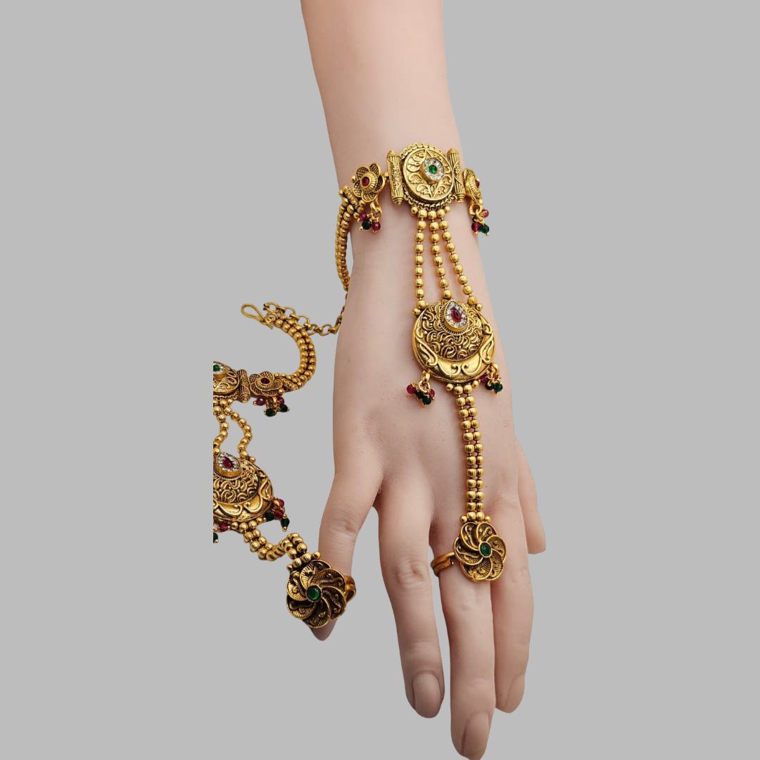 No ReviewsElevate your traditional look with this exquisite antique finish hathphool set, designed to add timeless elegance to your hands. This beautifully crafted piece features intricate detailing with a vintage-inspired design, connecting a statement ring to a graceful hand chain and bracelet.