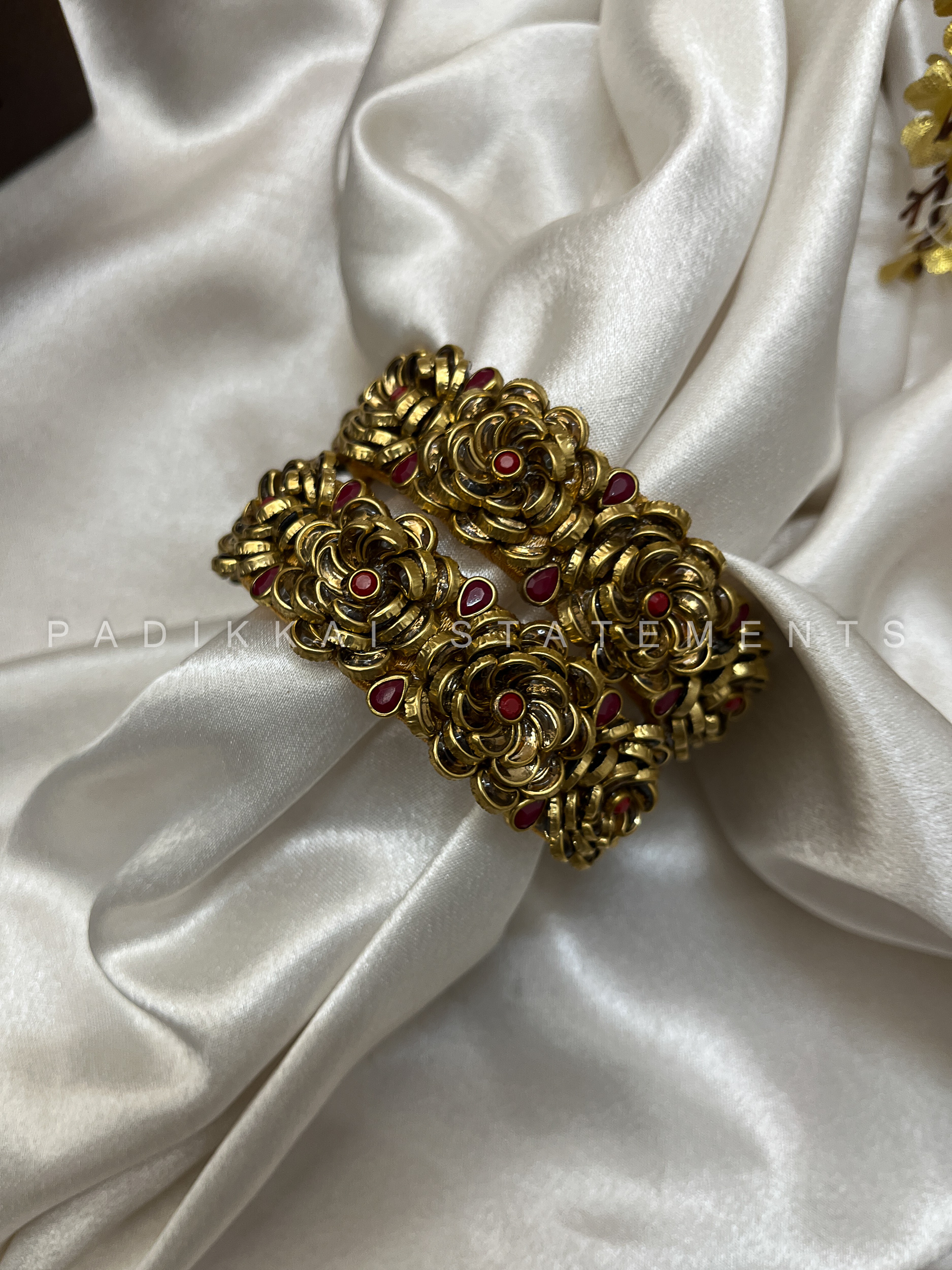This rose themed kada pair is finished in Antique Gold with Maroon accents and a sculpted 3D bloom, creating a look that feels both heirloom and current because gold remains the traditional marker of blessings in weddings while deep reds hold the visual language of ceremony and celebration.
