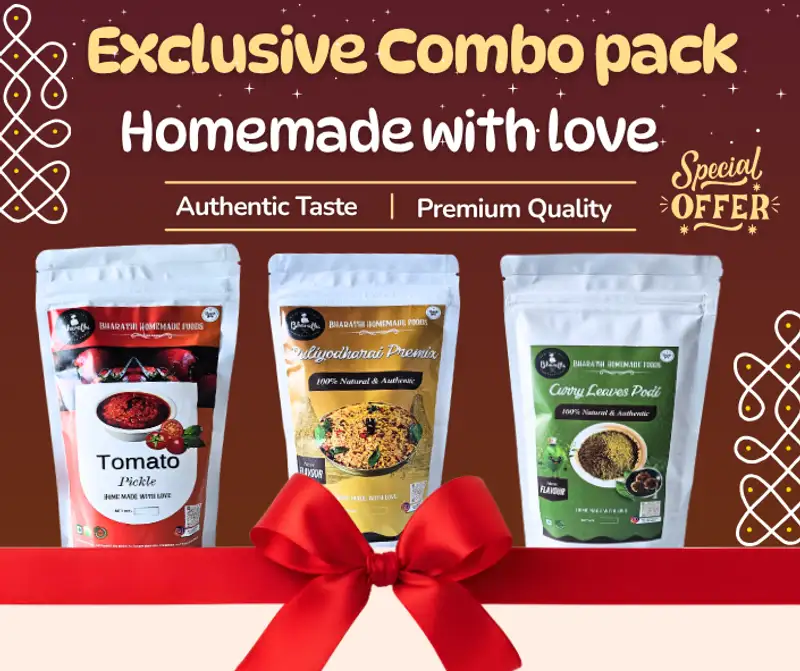 Our BHF Combo Pack brings together everyone’s favourite South Indian tastes - a perfect hot rice mix lovingly prepared by Amma using simple, traditional ingredients. Enjoy the authentic temple-style Puliyodharai Premix, our signature spicy Tomato Pickle, and the fresh, aromatic Curry Leaves Podi.