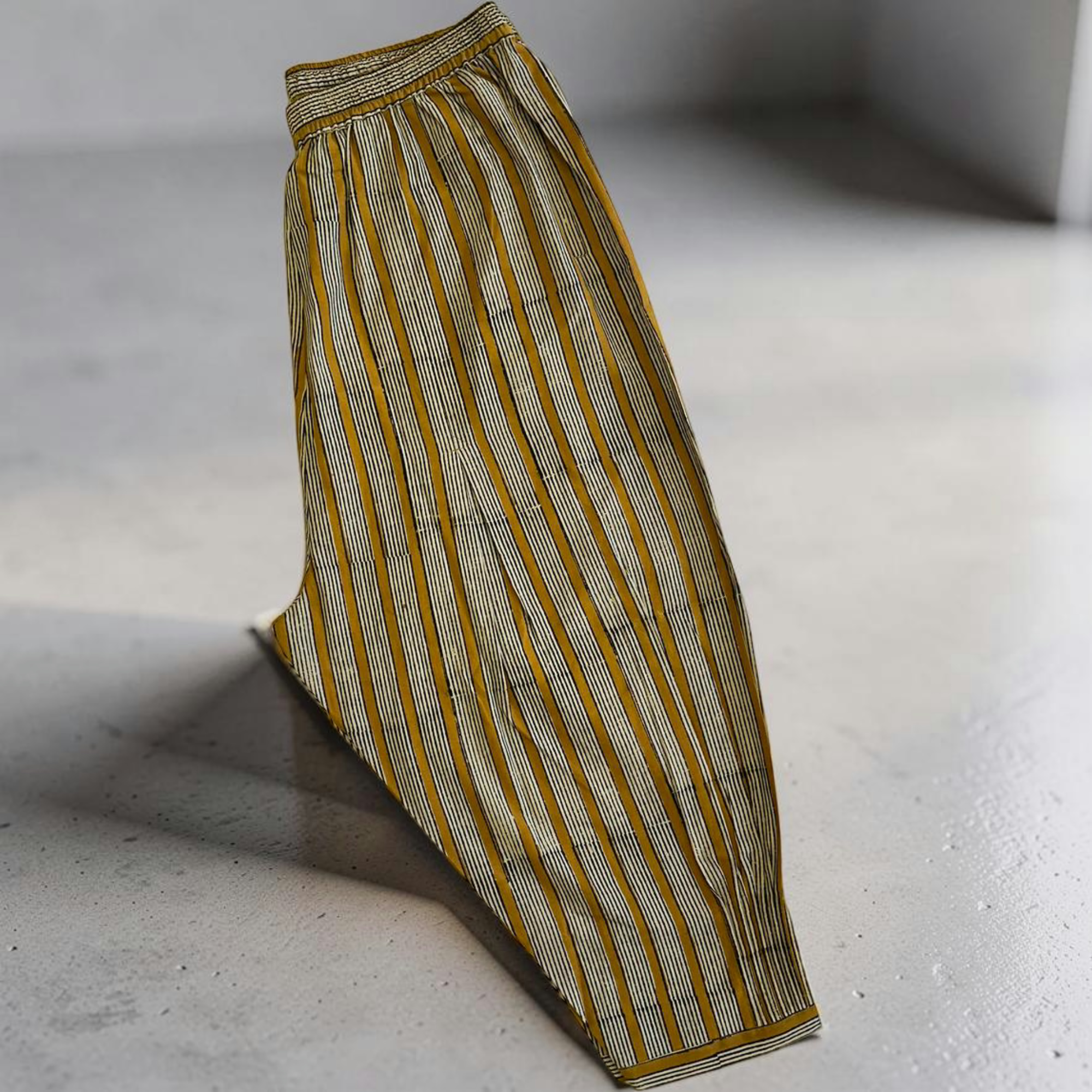 Pleated comfort pants in soft, breathable cotton, featuring hand block prints with subtle artisanal charm. Designed with a relaxed fit and gentle pleats for ease and fluid movement, finished with a flattering ankle-length cut.
