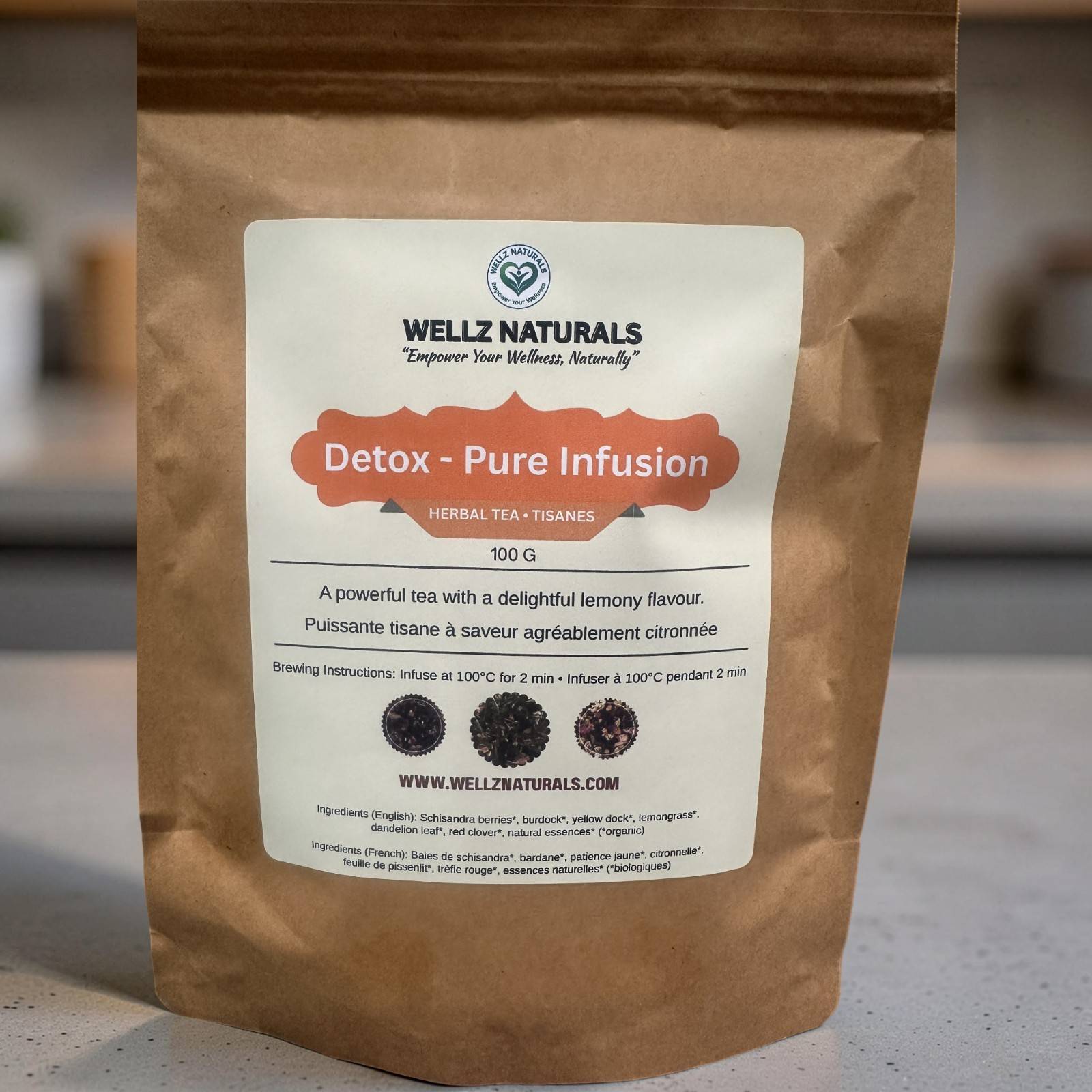 No ReviewsRefresh your body and mind with our Detox – Pure Infusion Herbal Tea, a cleansing blend created to support natural detoxification while delighting your senses with a bright lemony flavor. This revitalizing infusion combines the power of schisandra berries, burdock root, yellow dock, lemongrass, dandelion leaf, and red clover to help flush out toxins, promote liver health, and restore balance.