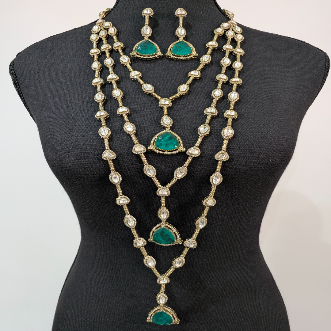 No ReviewsMake a statement with this luxurious multi-layer necklace set, designed to bring royal elegance to your look. Featuring intricate kundan-style craftsmanship with stunning emerald green stone accents, this set is perfect for weddings, festive occasions, and special events. The layered design adds depth and grandeur, while the matching earrings complete the look beautifully. A timeless piece that blends traditional charm with a modern statement.