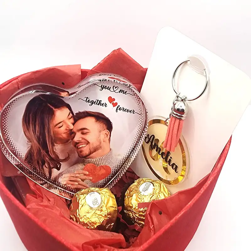 No ReviewsForever Crystal Crush - Gift Set Make a heartfelt statement with this beautiful, personalized crystal gift! Features: Customizable Photo: Upload your favorite photo for a unique touch High-Quality Glass Crystal: Durable and long-lasting, with a luxurious feel Heart-Shaped Design: Perfect for symbolizing love and affection Generous Size: 10.5 x 11 cm (4.1"x4.3") for a stunning display Individual Box Packaging: Beautifully presented for gifting or storage Gift Set Includes: 1 x Forever Crystal Crush Heart-Shaped Crystal with personalized photo 2 x Ferrero Rocher Chocolates 1 x Acrylic Keychain or Metal Key chain Perfect for: Personalized gifts for anniversaries, weddings, or birthdays Customized presents for loved ones, family, or friends A thoughtful, unique addition to any home decor or office space Why choose Forever Crystal Crush? Personalized with your favorite photo High-quality glass crystal construction Heart-shaped design perfect for symbolizing love Generous size for a stunning display Beautifully packaged in a stunning Red velvet heart-shaped box, complete with name elegantly printed on it RETURN & REFUND POLICY Personalized products can be returned or exchanged under the following conditions: Defective or Damaged Products: If the product arrives defective or damaged, we will replace it free of charge.
