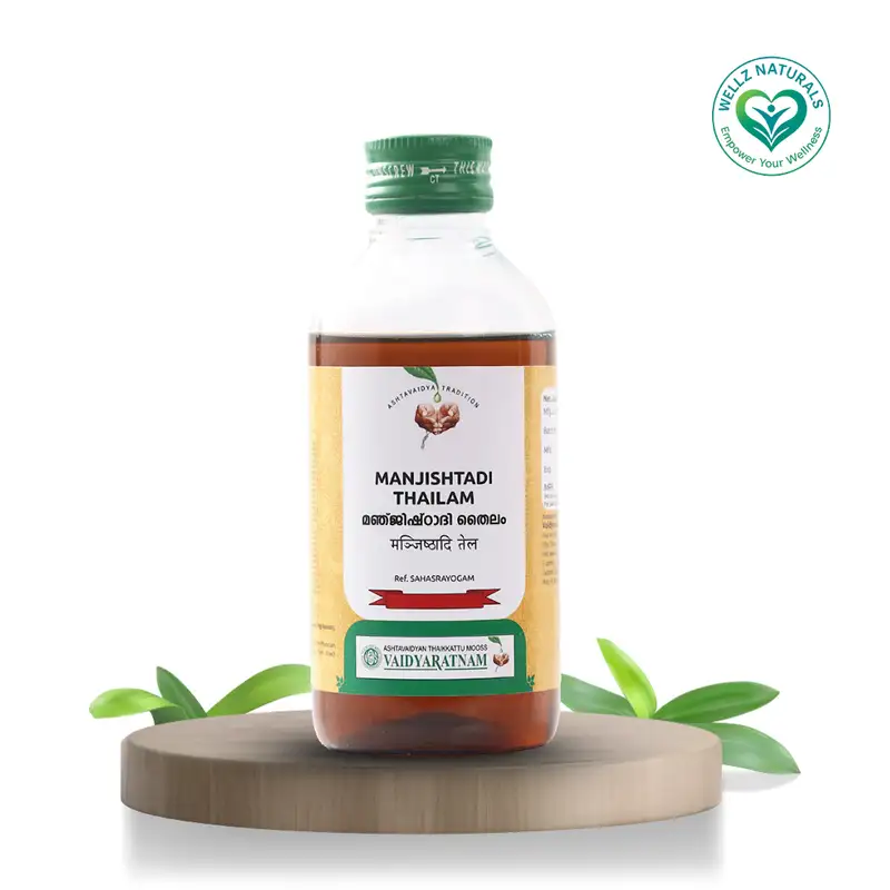 Experience the purifying touch of Ayurveda with Manjishtadi Thailam, a classical herbal oil known for promoting clear, even-toned, and radiant skin.