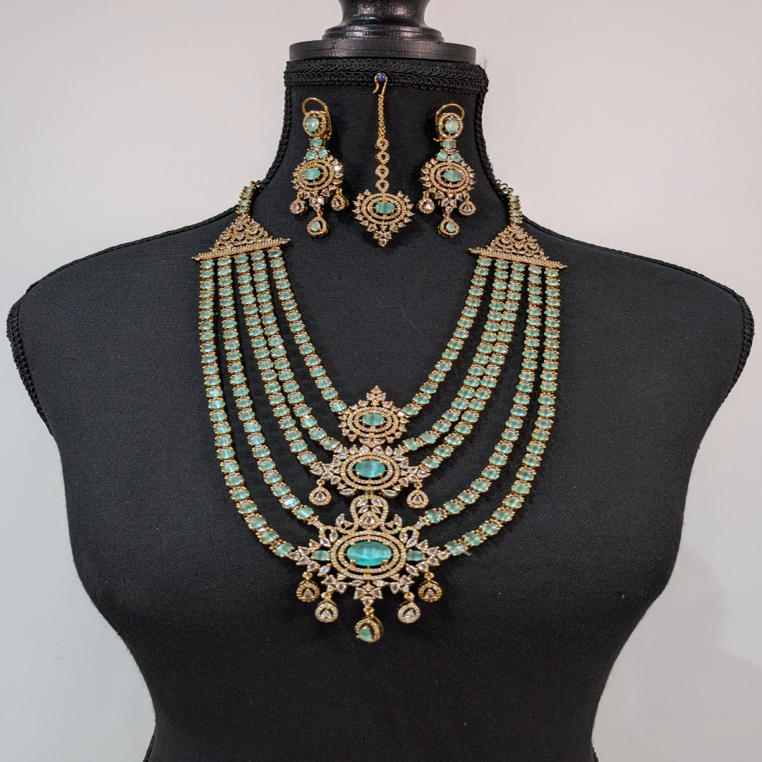 No ReviewsElevate your look with this stunning multi-layer necklace set featuring soft mint green stones paired with intricate kundan-style detailing. Designed to create a royal and graceful statement, this set beautifully blends elegance with traditional craftsmanship. The layered bead strands add richness and volume, while the detailed pendant and matching earrings enhance the overall charm. Perfect for weddings, receptions, and festive occasions.
