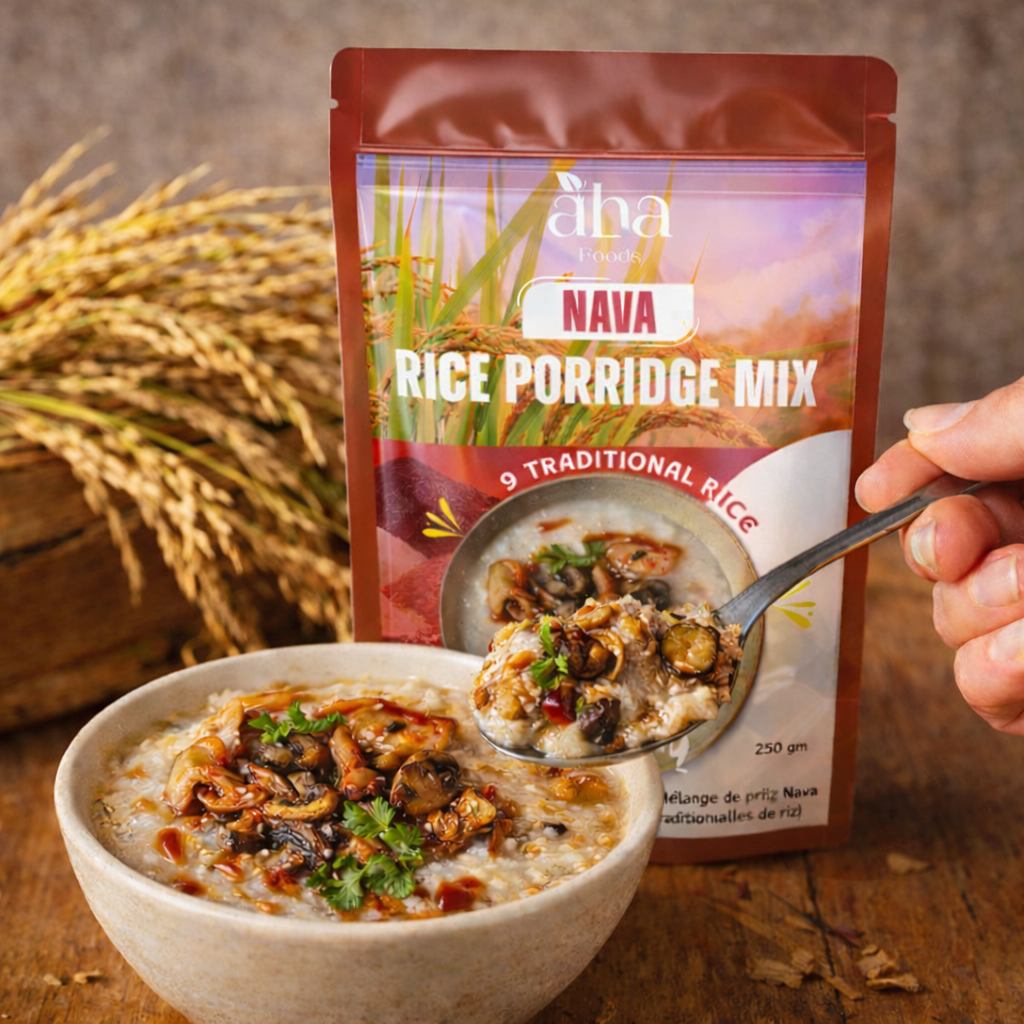 No ReviewsAha Foods Nava Rice Porridge Mix is a carefully curated blend of 9 heritage rice varieties and grains, including Karuppu Kavuni, Kaatuyanam, Karunkuruvai, Mapillai Samba, Poongar, Navara, Kalabath, Iluppai Poo Samba, and Red Jowar. These traditional grains have been trusted by generations for their nutritional and healing properties.