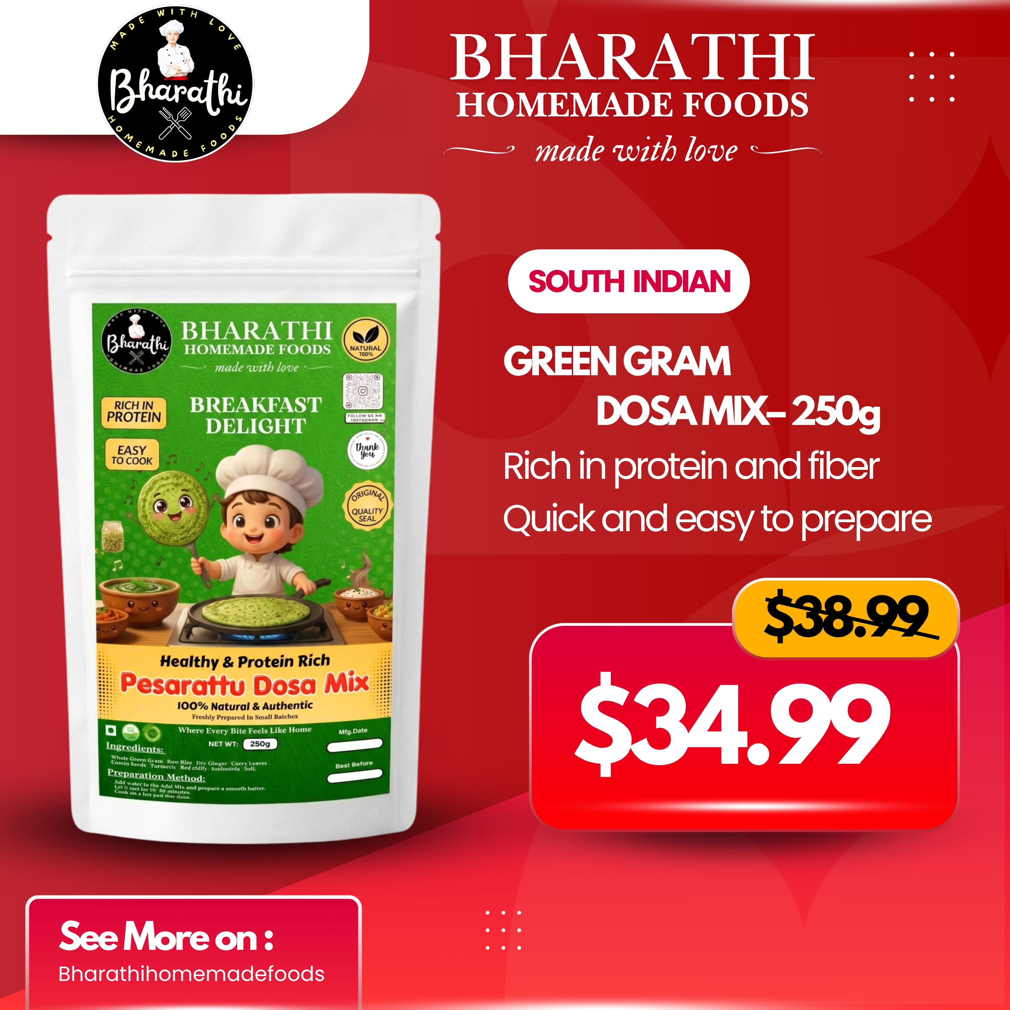 No ReviewsExperience the healthy goodness of traditional South Indian cuisine with our Bharathi Homemade Foods Pesarattu Dosa Mix (Green Gram Dosa Mix). Made with high-quality green gram (moong dal) and carefully selected spices, this mix brings you a protein-rich, soft yet crispy dosa that is both nutritious and delicious. Known for its light, wholesome nature, pesarattu is a perfect choice for a healthy lifestyle. Prepared using our amma’s authentic home-style recipe, every bite is filled with flavour, nutrition, and the comfort of homemade food.