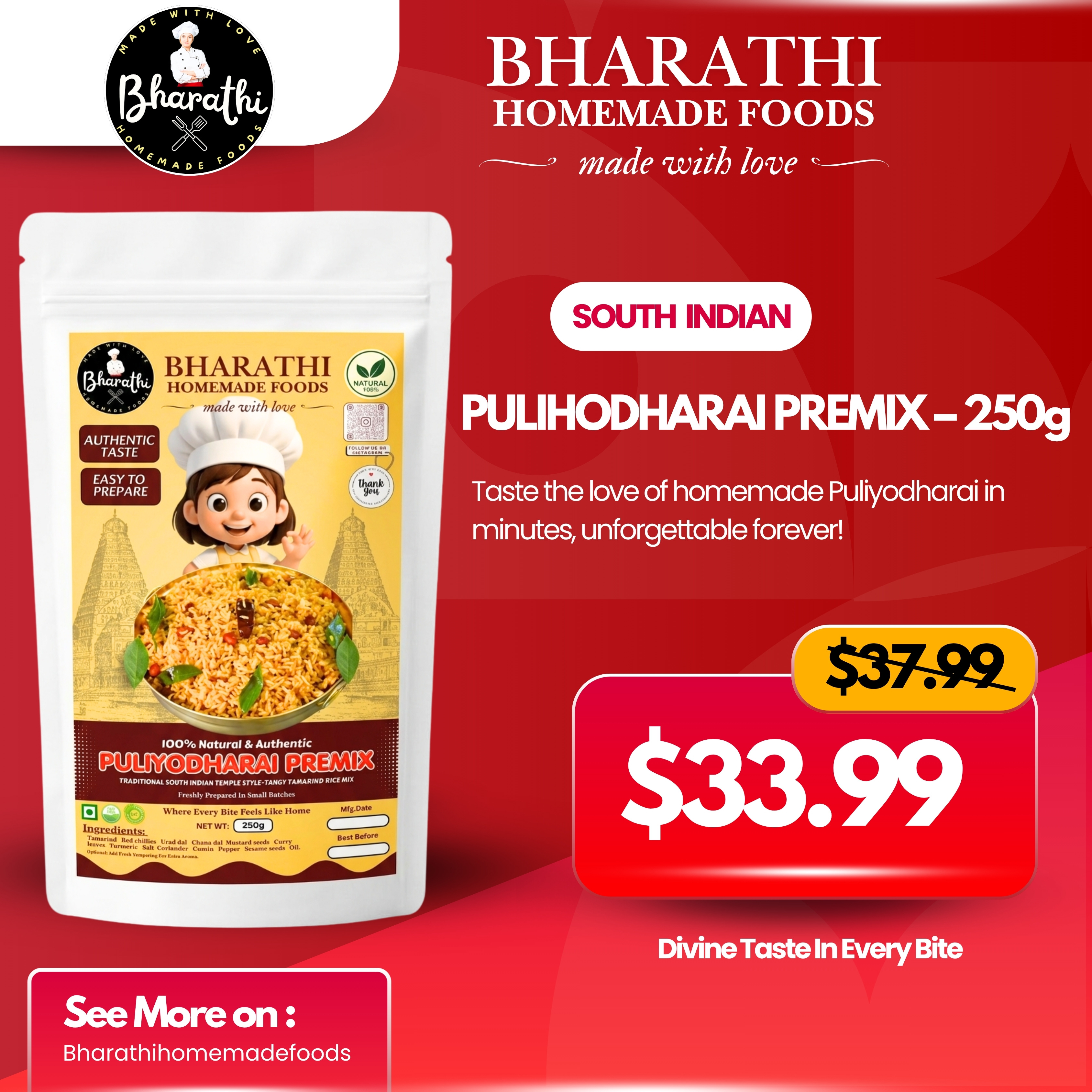 No ReviewsExperience the authentic taste of South Indian tradition with our Bharathi Homemade Foods Puliyodharai Premix. Our Puliyodharai Premix is made with a perfect balance of tangy tamarind, aromatic spices, roasted lentils, and traditional homemade flavours that bring you the comforting taste of temple-style tamarind rice at home.