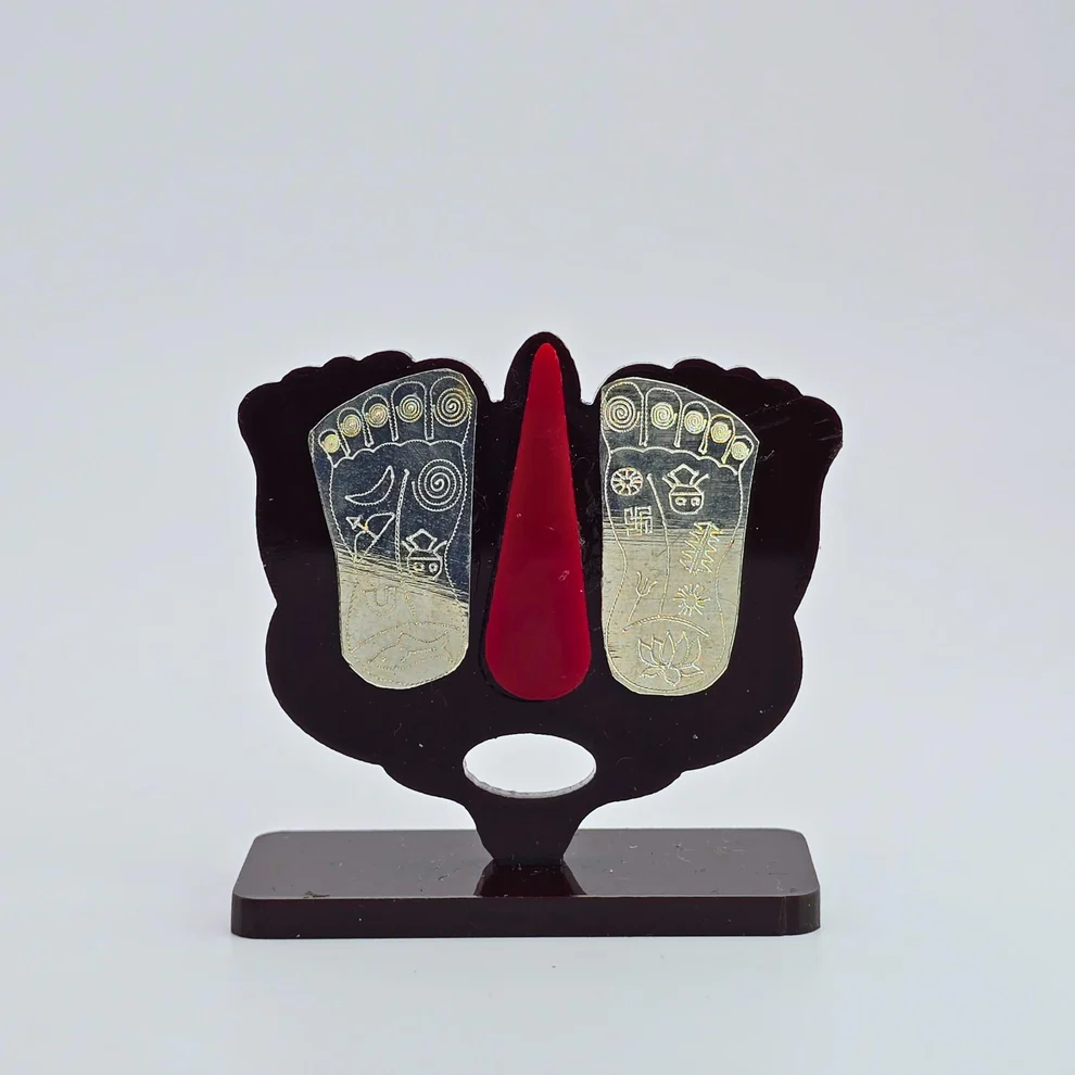 Invite divine blessings into your space with this elegantly crafted Pure Silver Balaji Paduka stand, featuring sacred footprints and a finely detailed Namam holder. Set on a rich brown acrylic base, it creates a beautiful contrast—like pairing earthy tones with a hint of silver shimmer.