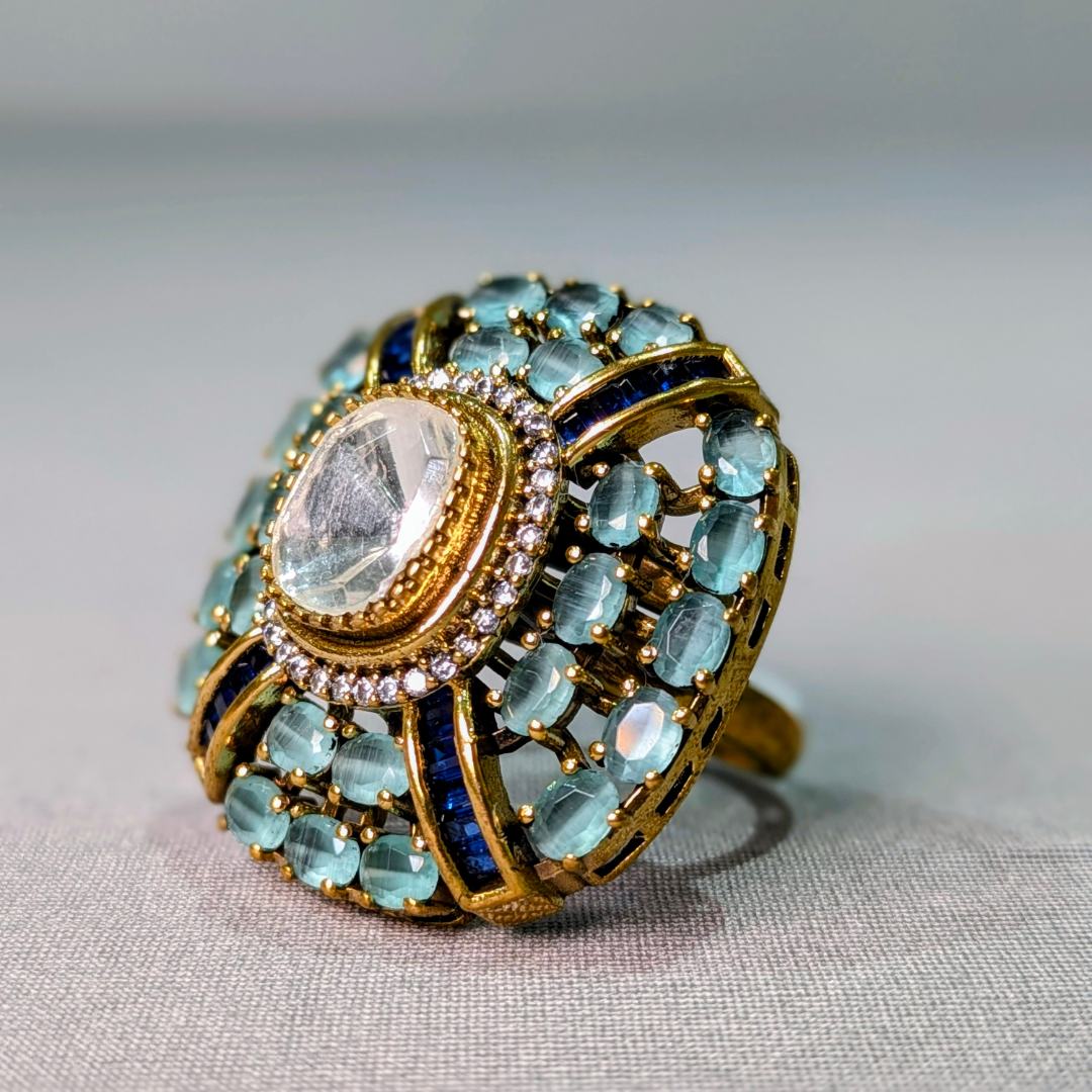 No ReviewsAdd a touch of vintage luxury with this stunning Victorian finish statement ring, beautifully designed with soft pastel-toned stones and intricate gold detailing. The centerpiece is surrounded by delicate crystal accents, giving it a rich and elegant look. Its adjustable design ensures a comfortable fit, making it perfect for effortless styling.