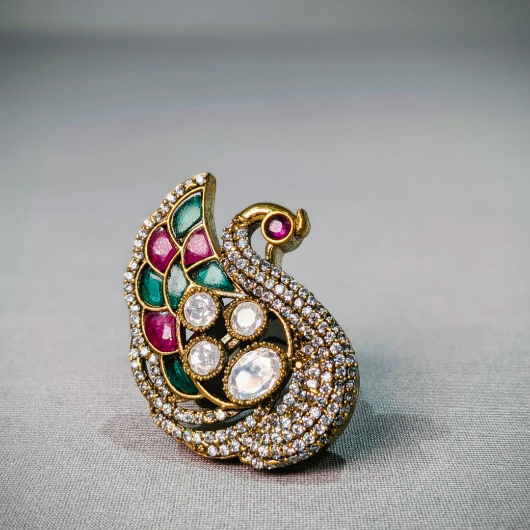 No ReviewsMake a graceful statement with this stunning Victorian finish peacock ring, beautifully crafted with a blend of AD stones and kundan detailing. The intricate peacock-inspired design, enhanced with vibrant color accents and shimmering stones, adds a royal and artistic touch to your look. Designed for both elegance and comfort, the adjustable band ensures a perfect fit for any finger.
