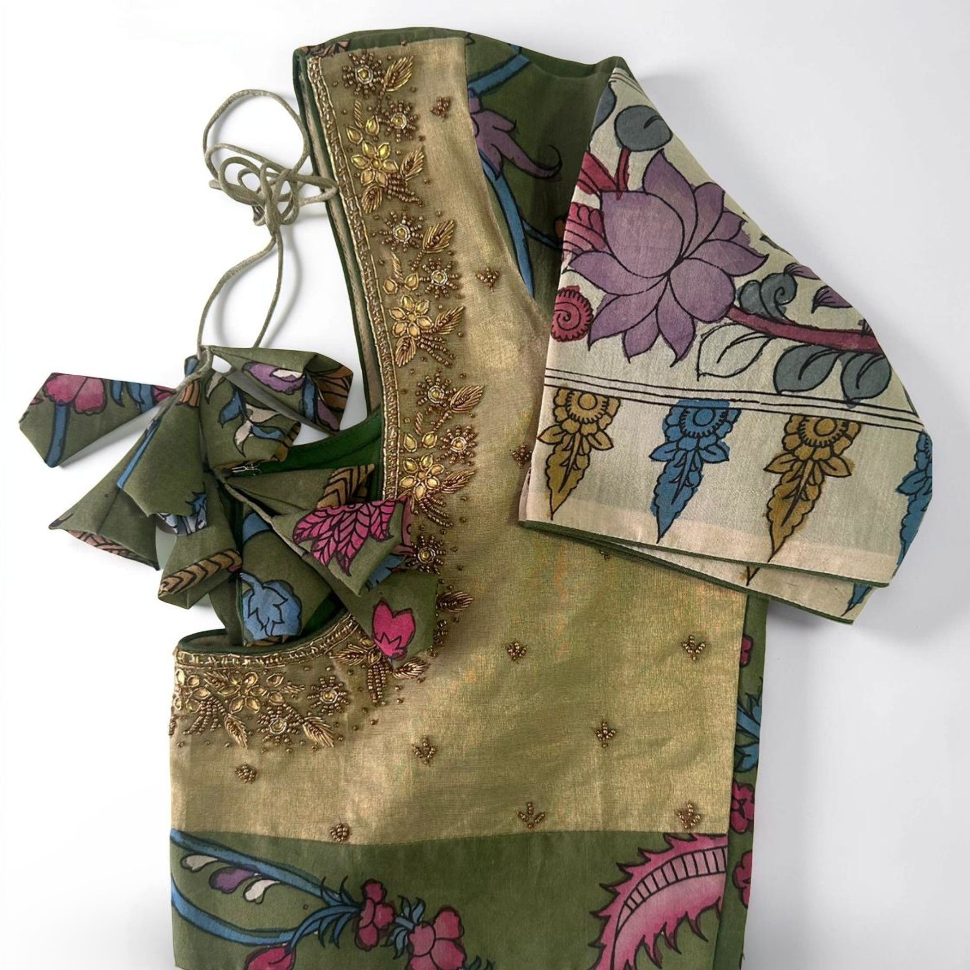 No ReviewsElegant Elachi green saree blouse crafted on luxurious green silk tissue, beautifully complemented with pen Kalamkari detailing. The blouse is meticulously hand-embroidered using rich gold zardosi work, further enhanced with intricate kundan embellishments. A perfect blend of traditional artistry and refined craftsmanship, this piece adds a regal and timeless charm to any ensemble.