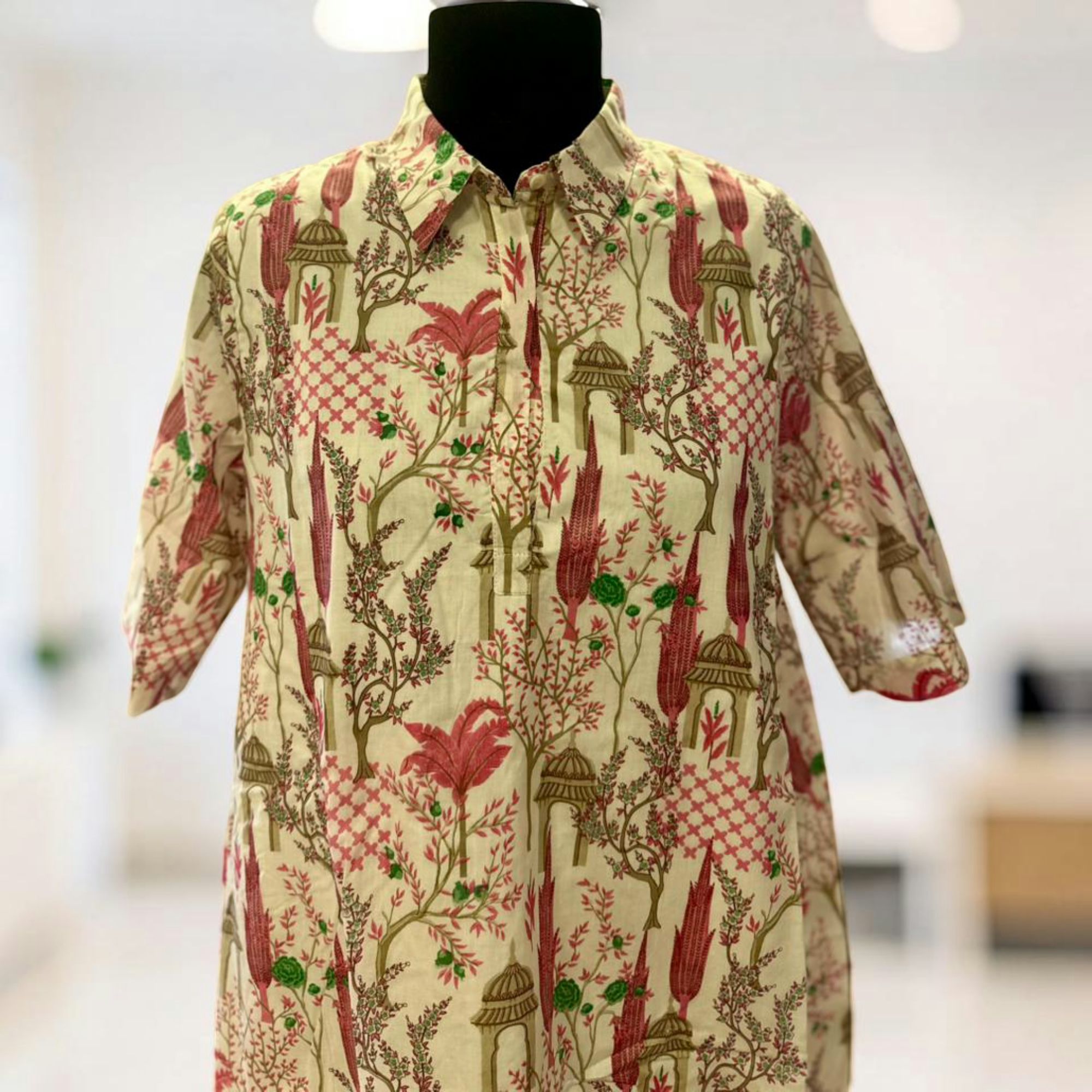 A breezy printed shirt featuring a delicate floral and leaf motif with a unique back slit detail for added style. Designed in a relaxed fit with short sleeves, it’s perfect for effortless everyday elegance.